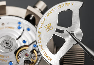 The exclusive mechanical movement of AGELOCER watches is self - winding, with 27 jewels, a diameter of 31.9 mm, a thickness of 5.6 mm, a power reserve of 80 hours, and a frequency of 28,800 vibrations per hour.