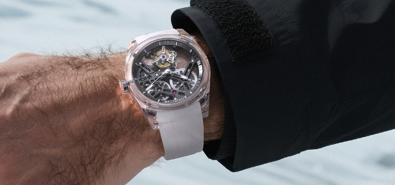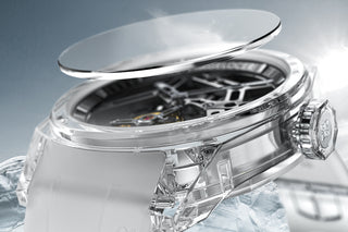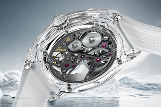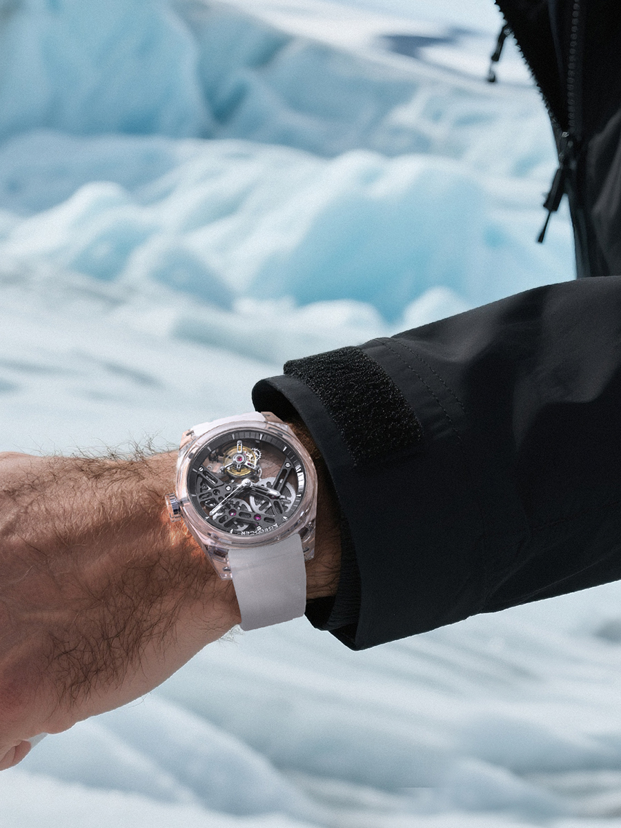 To commemorate World Glacier Day and call for greater attention to climate change, AGELOCER created a fully transparent, non-caloric flying tourbillon based on the concept of "never-melting ice."