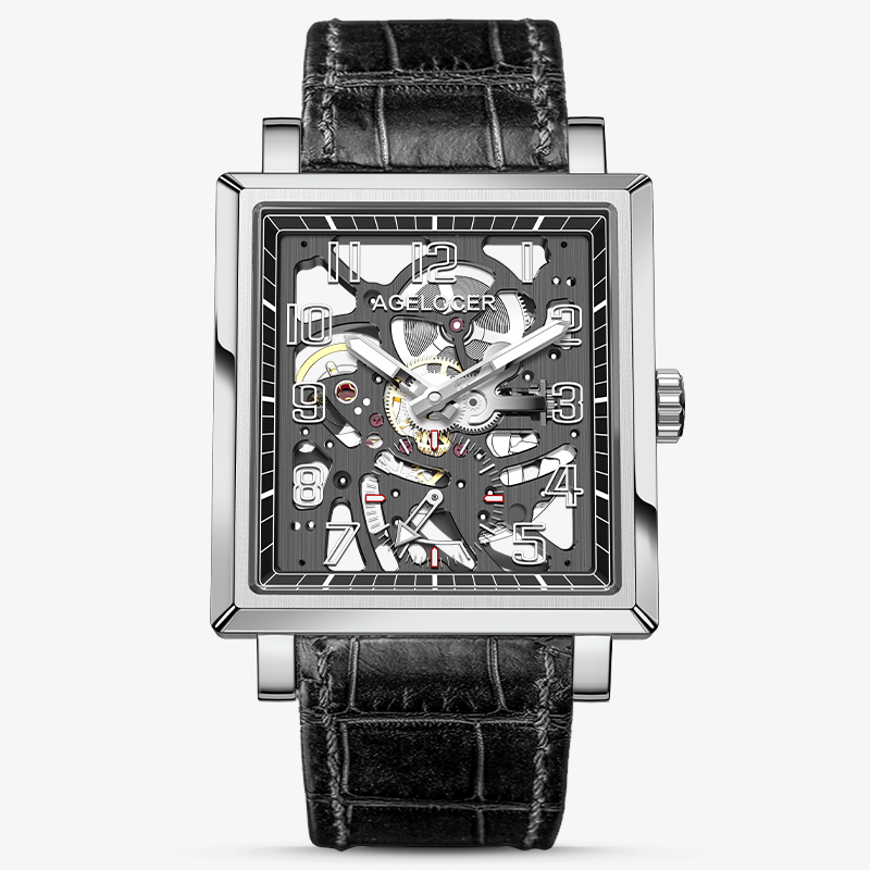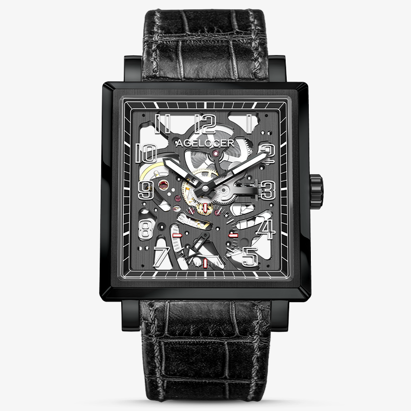 Fine polished self-developed movement, Incabloc triangle shock absorber, 17 synthetic jewel bearings, Super-Luminova luminous system transparent dial, transparent on both sides.  Revitalization in science fiction and fashion The CODEX hollow series reserve the retro square design. With the transparent sapphire glass, the hollow design allows people to clearly see the precise mechanical operation inside the watch: the rhythm of the escapement and the meshing of gears move slowly in the square movement. With the mechanical aesthetics and square case, CODEX presents new vitality in the science fiction and fashion.