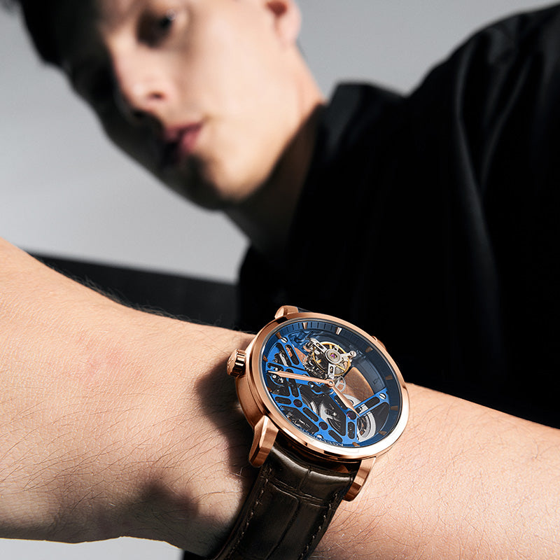 AGELOCER take modern architecture as inspiration for our watch design and create a floating castle between our wrists. Remove the traditional dial to allow the wearer to clearly see the light and shadow produced by the hollowed-out skeleton of the movement, expressing an unprecedented architectural design aesthetics.